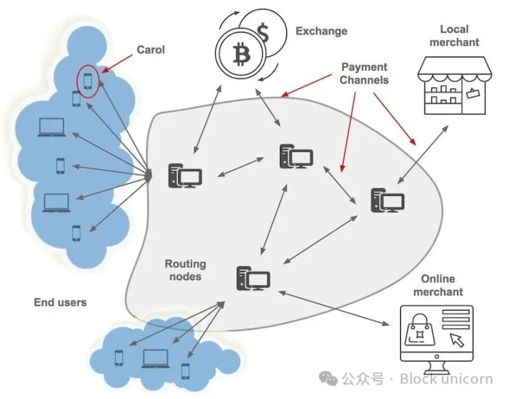 これらのチャネルは相互接続可能です。アリスがボブとのチャネルを持ち、ボブがキャロルとのチャネルを持っている場合、アリスはボブを介してキャロルに支払いを行うことができます。ネットワークは相互接続された支払いチャネルのシステムを形成し、即時かつ低手数料の取引を処理します。