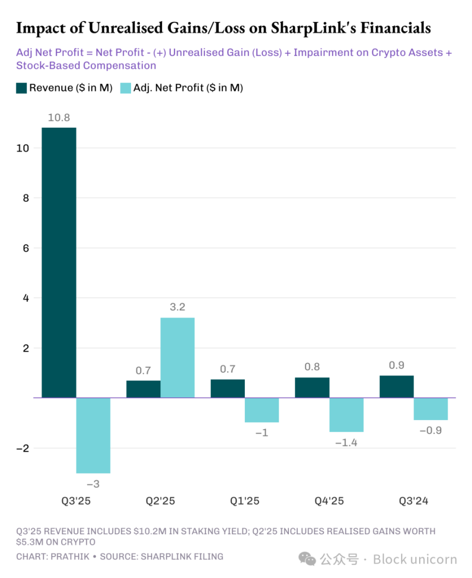 今四半期、シャープリンクの収益の約95%はETHステーキングによる利益でした。純利益は2024年第3四半期の純損失90万ドルから100倍の1億430万ドルに急増しましたが、水面下に問題が潜んでいます。他の多くのDATプロジェクトと同様に、シャープリンクの利益はすべて、保有ETHの未実現利益から得られています。