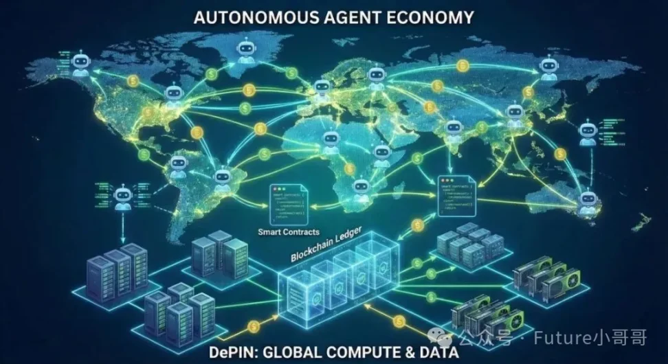 分散型物理インフラネットワーク連携(DePIN):AIの運用には膨大なコンピューティングパワー(GPU)とデータが必要です。DePINネットワーク(io.netやRenderなど)を通じて、AIエージェントは世界中の個人や企業から遊休コンピューティングパワーを直接レンタルし、トークンを使用してリアルタイムで決済できます。これにより、中央集権型クラウドサービスプロバイダー(AWS、Google Cloud)の独占がある程度打破され、AIの運用コストが削減されるとともに、ブロックチェーンに現実的なユーティリティシナリオが提供されます(ただし、プロジェクトや参加者の初期のコンピューティングパワーソースは、元の大手企業からのものである可能性が高いため、その後のレンタルは独立して選択され、絶対的な独占が打破されます)。人間のユーザーが日常的にモバイル決済を行う一方で、AIエージェントがバックグラウンドのオンチェーンネットワークで大規模な価値交換を自動的に完了し、広大で効率的なシャドーエコノミーを形成することが予測されます。