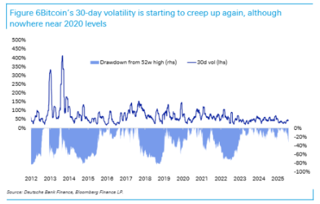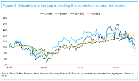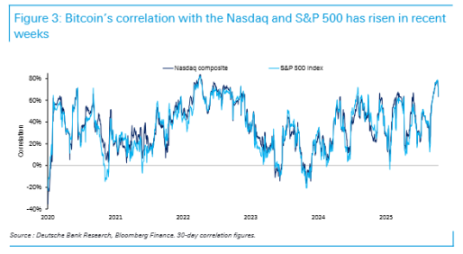 ドイツ銀行は、米国政府閉鎖、世界的な貿易摩擦の再燃、AI関連の評価に対する懸念、そして米国株の下落により、ビットコインの価格変動は市場に依存しない価値保存手段というよりも、高成長ハイテク株の値動きに似ていると指摘している。