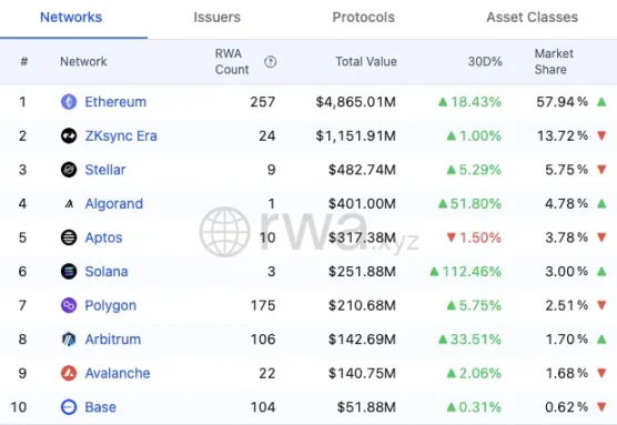 従来の金融コミュニティは長い間、イーサリアムとその第2層のエコシステムに注目してきました。 Solana と比較すると、その技術アプリケーションはより早くリリースされ、市場での受け入れ度も高くなっています。 RWA.xyzのデータによると、イーサリアムとその第2層のエコシステムはRWAの価値の50%以上を占めています。