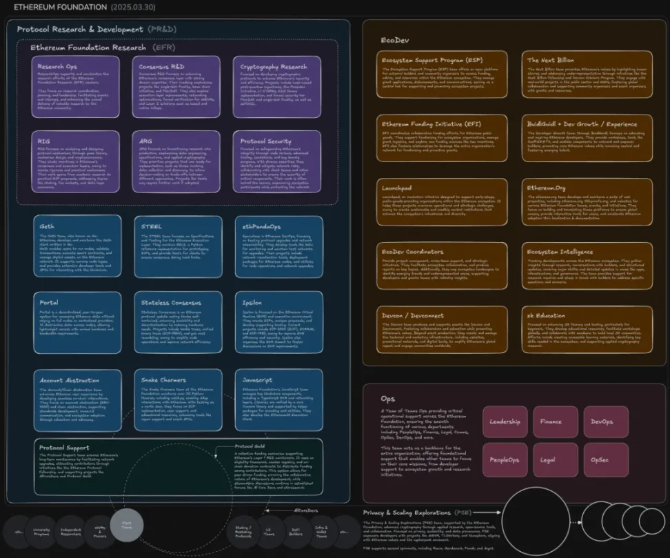 EF の組織構造は、プロトコル研究開発 (PR&D)、エコシステム開発 (EcoDev)、運用サポート (Ops)、プライバシーおよび拡張調査 (PSE) の 4 つの主要な機能セクションに分けられます。各セクションはそれぞれ独自の責任を持ち、「プロトコルギルド」および「プロトコルサポート」チームの調整の下、外部のコミュニティ、研究機関、開発チームと連携しています。
