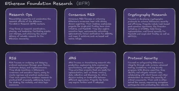 プロトコルの中核開発を担当する研究チームも、2024年後半から2025年初頭にかけて大きな変化を遂げました。2025年初頭、イーサリアム財団研究部門(EFR)は、当初の単一の研究チームから、アプリケーション研究グループ(ARG)、コンセンサスR&D、暗号化、プロトコルセキュリティ、ロバストインセンティブグループ(RIG)の5つの専門グループに再編されました。この分割は、暗号とセキュリティの分野で財団が急速に拡大したことに起因しており、さまざまな研究方向に焦点を当て、研究開発の効率と透明性を向上させるために、より多くの専門チームが必要になります。一方、長年の研究者であるアレックス・ストークス氏と、直近の共同研究ディレクターであるバルナベ・モノ氏が共同で研究の方向性を主導しています。