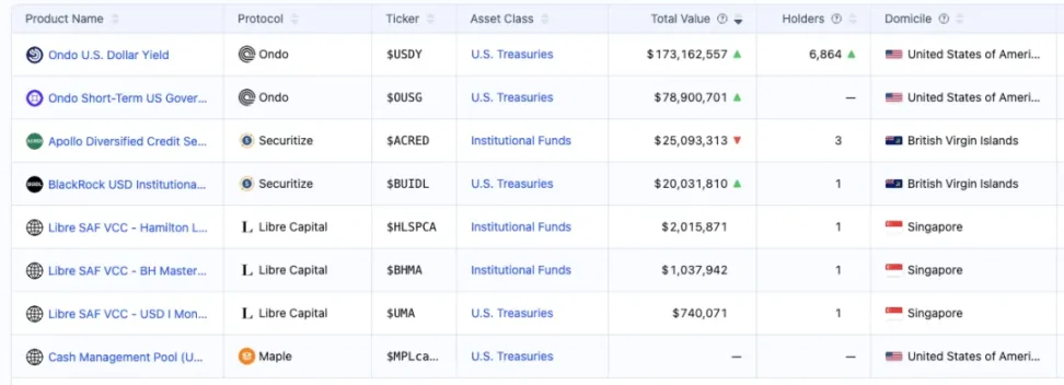対照的に、Solana は従来の金融機関との提携が少ない。同時に、Solana の RWA は主にステーブルコインに集中しており、非ステーブルコイン資産の割合は Ethereum よりも低くなっています。現在、主流となっている国債およびその他のファンドプロジェクトを図に示します。関連プロジェクトの数および量は比較的少ないです。同時に、プロジェクトのカテゴリーは比較的単一であり、大規模なコモディティRWAプロジェクトやプライベートクレジット、プライベートエクイティなどの分野はまだカバーされていません。