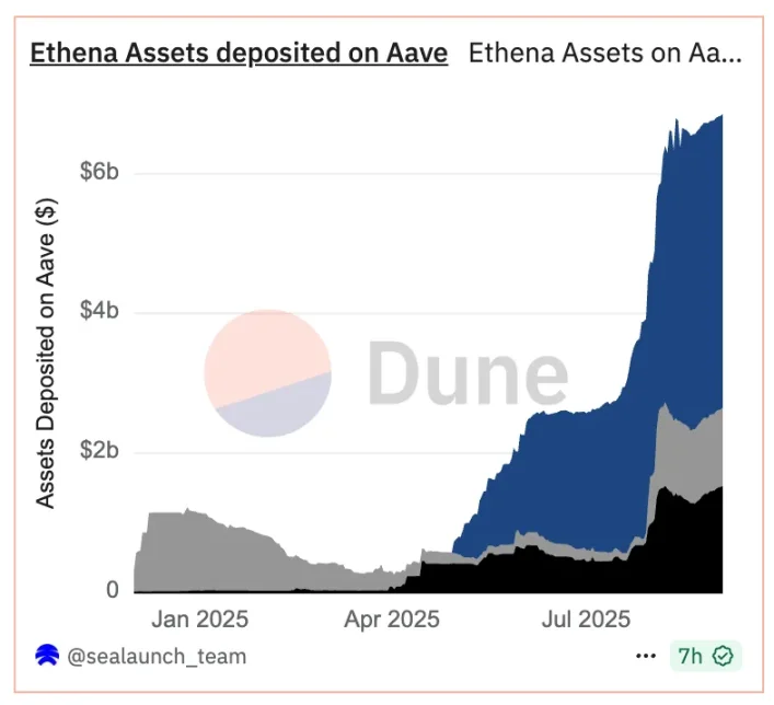 金融工学の熱狂:ユーザーはUSDeをステークしてsUSDe(利回りトークン)を取得し、それをPendle(利回りデリバティブプラットフォーム)でトークン化し、そのトークンを使ってAave(レンディングプロトコル)でさらに多くのUSDeを担保にするというサイクルを繰り返すことができることを発見しました。この再帰的な利回りサイクルにより、抜け目のないトレーダーはUSDe利回りへのエクスポージャーを拡大することができました。その結果、Pendleの預金の70%はEthena資産となり、Aaveは66億ドルのEthena資産を保有しています。この「レバレッジ内レバレッジ」戦略は、2桁のリターンを目指しています。