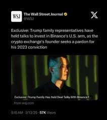 2025年3月、ウォール・ストリート・ジャーナルが突如として報じました。トランプ一族の代表者が2024年からバイナンスと緊密に協議し、バイナンス米国支社の株式取得について協議していたというのです。また、CZが大統領の恩赦を求めていることも報じられました。この報道は業界に衝撃を与え、CZは再び脚光を浴びることとなりました。