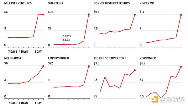 暗号通貨事業への移行を発表する前の取引日における、デジタル資産トレジャリー企業 8 社の株価の変動。