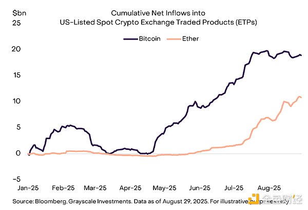 8月にビットコイン価格が下落する一方で、イーサ(ETH)は16%上昇しました。時価総額で世界第2位のパブリックブロックチェーンであるイーサは、規制変更に関する投資家の懸念から恩恵を受けているようです。これは、イーサリアムが現在業界をリードしているステーブルコイン、トークン化資産、分散型金融(DeFi)アプリケーションの普及を後押しする可能性があります。