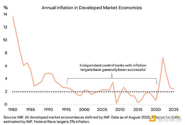 したがって、不換紙幣が効果的に機能するためには、政府がシステムを悪用しないという約束を守ることを保証する手段が必要です。米国およびほとんどの先進市場国では、中央銀行に明確な目標(通常はインフレ目標の形で)と運用上の独立性を与えるというアプローチが取られています。民主的な説明責任を確保するために、公選の役人は通常、中央銀行に対して一定の監督権を持ちます。新型コロナウイルス感染症のパンデミックに伴う一時的なインフレの急上昇を除き、明確な目標、運用上の独立性、そして民主的な説明責任に基づくこのシステムは、1990年代半ば以降、主要経済国において低水準で安定したインフレ率を実現してきました(図6)。