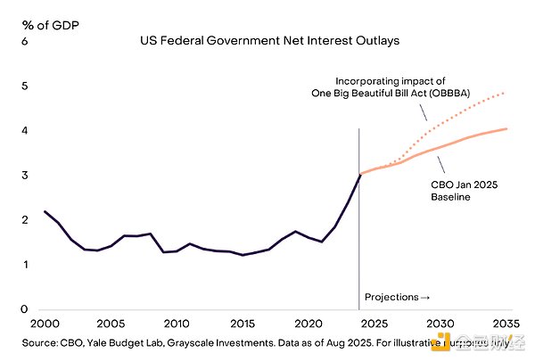7月に可決された「ビッグ・ビューティフル・ビル(OBBBA)」は、今後10年間、高水準の財政赤字を固定化することになる。金利が下がらない限り、利払い費の増加を招き、政府歳入の他の使途がさらに圧迫されることになる。そのため、ホワイトハウスは連邦準備制度理事会(FRB)に対し、繰り返し金利引き下げを迫り、パウエルFRB議長の辞任を求めてきた。FRBの独立性に対するこうした脅威は、FRBの7人で構成される理事会の現理事6人のうちの1人であるリサ・クック氏が8月に解任されたことで、さらに高まった。これは短期的には選出された議員にとってプラスとなるかもしれないが、FRBの独立性を弱めることは、長期的な高インフレと金融緩和のリスクを高める。