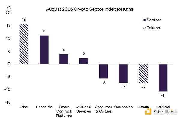 図1は、Grayscaleの「Crypto Track」フレームワーク(FTSE Russellとの提携により開発された、厳格なデジタル資産分類とインデックスポートフォリオ)を用いて、8月の様々なセクターの変化を示しています。通貨、消費者・文化、人工知能(AI)の仮想通貨トラック指数は、いずれも前月比でわずかに下落しました。AIセクターの弱さは、公開株式市場におけるAI関連銘柄のパフォーマンスの低迷を反映しています。一方、金融、スマートコントラクトプラットフォーム、公益事業・サービスの仮想通貨トラック指数は、いずれもこの月中に上昇しました。前月比で下落したにもかかわらず、ビットコイン価格は8月中旬に約12万5000ドルの史上最高値に達し、ETH価格も5000ドル弱の史上最高値に達しました。