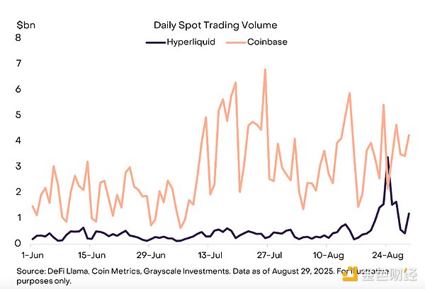 このドラマの一部は、スポット取引と無期限契約を提供する分散型取引所(DEX)であるHyperliquidで展開されました(https://www.jinse.cn/blockchain/3716302.htmlの「DEXの台頭」を参照)。8月20日以降、あるビットコインの「クジラ」(大口保有者)が約35億ドル相当のBTCを売却し、即座に約34億ドル相当のETHを購入しました。投資家の動機を特定することは不可能ですが、このような大規模なリスク移転が中央集権型取引所(CEX)ではなくDEXで発生していることは喜ばしいことです。実際、月間で取引高が最も高かった日に、Hyperliquidのスポット取引量は一時的にCoinbaseを上回りました(図3)。