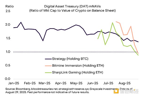 スポンサーがこれらの投資手段を継続的に提供しているにもかかわらず、価格動向は投資家の需要が飽和状態に達しつつあることを示唆しています。DATの需給バランスを測るため、アナリストは通常、企業の時価総額と貸借対照表上の暗号資産の価値の比率である「mNAV」を監視します。上場株式の形態における暗号資産の需要が過剰(つまりDATが不足)な場合、mNAVは1.0を超えて取引される可能性があります。一方、上場株式の形態における暗号資産の供給が過剰(つまりDATが過剰)な場合、mNAVは1.0を下回って取引される可能性があります。現在、一部の大型DATのmNAVは1.0に収束しているように見え、DATの需給が均衡に近づいていることを示唆しています(図表5)。
