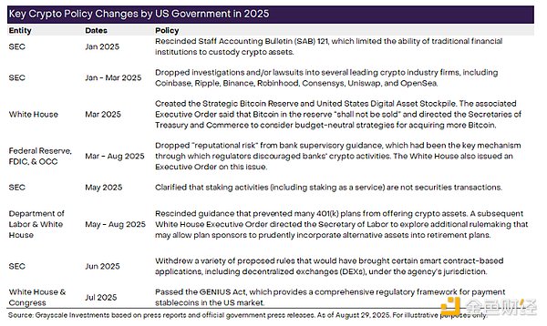 しかし、今年の米国の政策変更はステーブルコインにとどまらず、暗号資産のカストディから銀行規制ガイダンスに至るまで、幅広い問題を網羅しています。図表2は、トランプ政権と連邦政府機関による今年最も重要なデジタル資産に関する具体的な政策措置をまとめたものです。これらの政策変更、そして今後予定されているさらなる変更は、暗号資産業界全体にわたる機関投資家による投資の波を促しました(詳細は「機関投資家の連鎖反応」をご覧ください)。