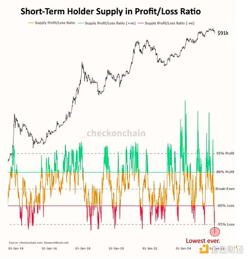 クインテン・フランソワ氏は、短期保有者の損益供給においても同様のダイナミクスが生じていると指摘しています。過去155日間に購入されたトークンの95%以上が現在損失を出していることがわかります。