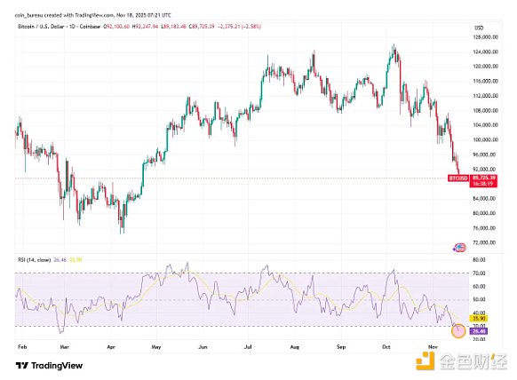 Coin Bureauのデータによると、「ビットコインの日次RSI指標は26まで下落し、2月以来の最低水準となった。これはビットコインが売られ過ぎ領域に入ったことを示している。」