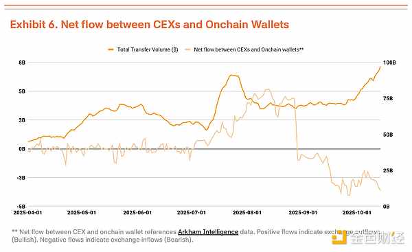 しかし、取引量の増加を単純にポジティブな兆候と解釈すべきではありません。中央集権型取引所への資金流入の最近の増加は、保有者が売却の準備をしていることを示唆することが多いのです(図6)。取引件数やアクティブユーザーといったファンダメンタル指標の改善が見られない状況下では、取引量の増加は、真の需要よりも短期的な資金流入と高ボラティリティによる売り圧力の方が大きいことを示唆しています。
