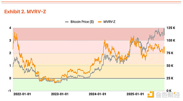 オンチェーン分析では過熱の兆候が見られますが、バリュエーションはまだ懸念すべき水準ではありません。MVRV-Z指標(時価総額対実現価値比率)は現在2.31と過熱領域にありますが、7月と8月に接近した極端なバリュエーションレンジと比較すると安定しています(図2)。