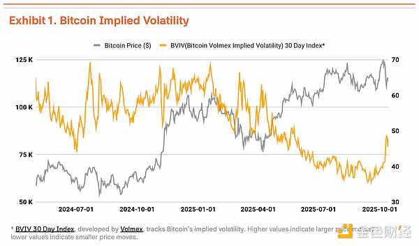 10月6日、ビットコインは過去最高値の12万6210ドルを記録しました。しかし、トランプ政権による中国への新たな貿易圧力を受け、ビットコイン価格は18%下落して10万4000ドルとなり、ボラティリティが大幅に上昇しました。Volmex Financeのビットコイン・ボラティリティ指数(BVIV)によると、機関投資家が着実に保有量を増やしたため、ビットコインのボラティリティは3月から9月にかけて縮小しましたが、9月以降は41%急上昇し、市場の不確実性を高めました(図1)。