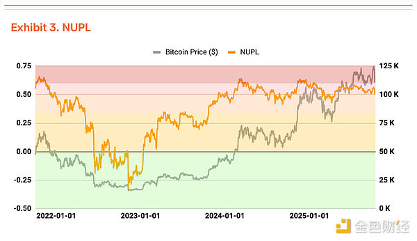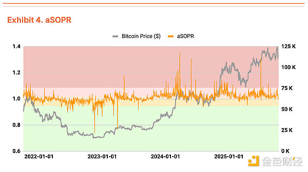 純未実現利益・損失比率(NUPL)も過熱の兆候を示しているが、第2四半期に見られた高い未実現利益水準からはやや緩和している(図3)。投資家の実現損益を反映する調整支出対産出利益比率(aSOPR)は均衡値1.03に非常に近い水準にあり、懸念材料はないことを示している(図4)。