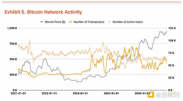 ビットコインの取引件数とアクティブユーザーベースは前四半期とほぼ同水準で推移しており、ネットワークの成長が一時的に鈍化したことを示唆しています(図5)。一方、総取引量は増加傾向にあります。取引件数の減少と取引量の増加は、より少ない取引数でより多くの資金が移動していることを示唆しており、大規模な資金移動の増加を示唆しています。