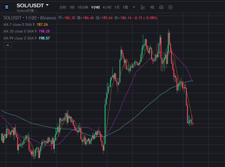 過去2日間で、SOLの価格は高値213ドルから187ドル付近まで急落し、約12%の下落となりました。パウエル・ナイトでの上昇分はほぼ全て失い、170~180ドルの主要サポートレンジを再び試している状況です。