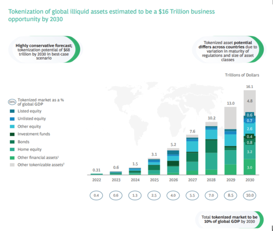 ボストン コンサルティング グループ(BCG)は、RWA(リアルマネー・エクスプロイテーション)市場が2030年までに16兆ドルに達し、現在の暗号資産市場全体の時価総額をはるかに上回ると予測しています。中央値予測の10兆ドルが達成されれば、RWA業界の価値は現在の54倍以上に増加することになります。