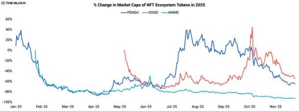 Azukiのトークン「ANIME」は、ほとんど反発が見られないことで際立っています。2025年1月下旬のローンチ直後から下落し、PENGUやDOODとは異なり、明確な上昇トレンドを経験することはありませんでした。価格は年間を通して着実に下落し、現在90%以上下落しており、3大NFTエコシステムの中で最もパフォーマンスの低いトークンとなっています。市場全体の「文化系コイン」への倦怠感が、当初の関心を完全に覆い隠してしまったようです。