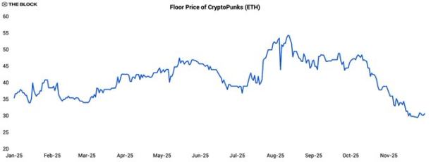 静かな一年であったにもかかわらず、CryptoPunksは一時的に注目を集めました。同シリーズの基本価格は2025年7月から8月にかけて約40%上昇し、7月中旬には約54 ETHでピークに達しました。しかしその後価格はほぼ半減し、本稿執筆時点では約30 ETHまで下落しています。