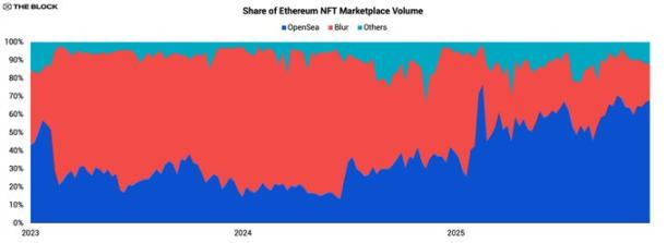 OpenSeaを例に挙げると、最も顕著な変化はイーサリアムNFT市場におけるシェアの逆転に反映されています。約3年間Blurにトップの座を明け渡した後、OpenSeaは2025年にトップの座を取り戻し、年間を通してそのリードを大幅に拡大しました。
