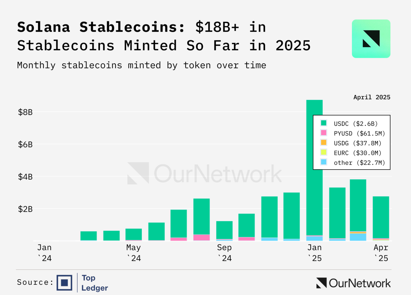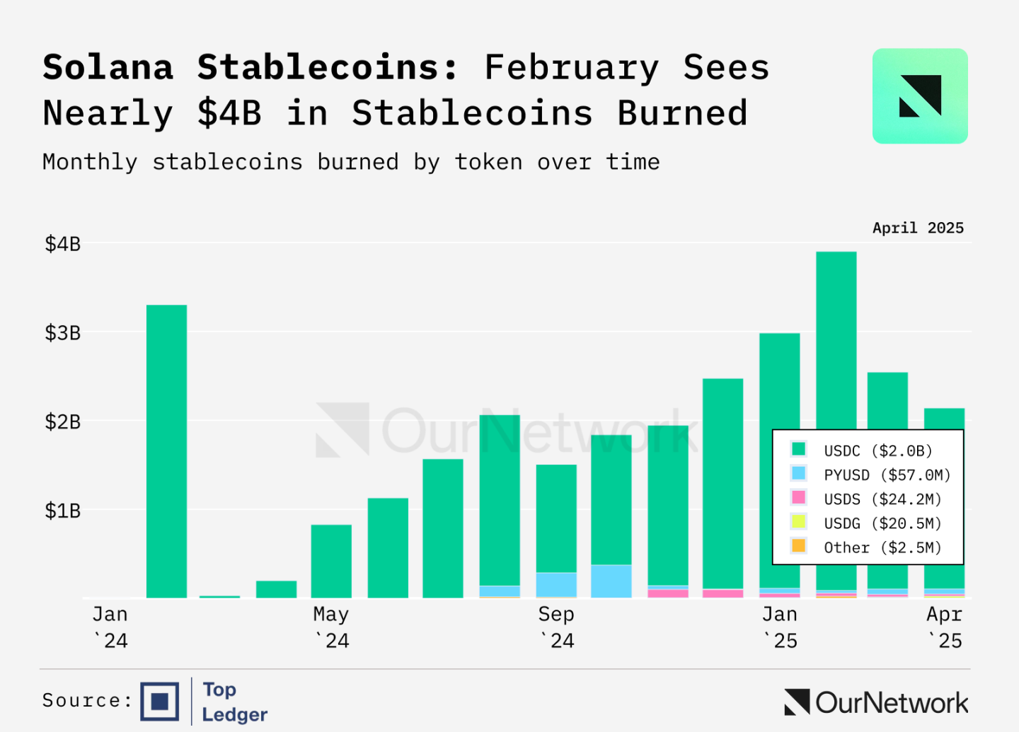 次のグラフは、ステーブルコインの月ごとの破壊と鋳造活動を示しています。 2025 年 1 月は、鋳造活動が破壊活動の 2 倍に達した画期的な月であったことがわかります。