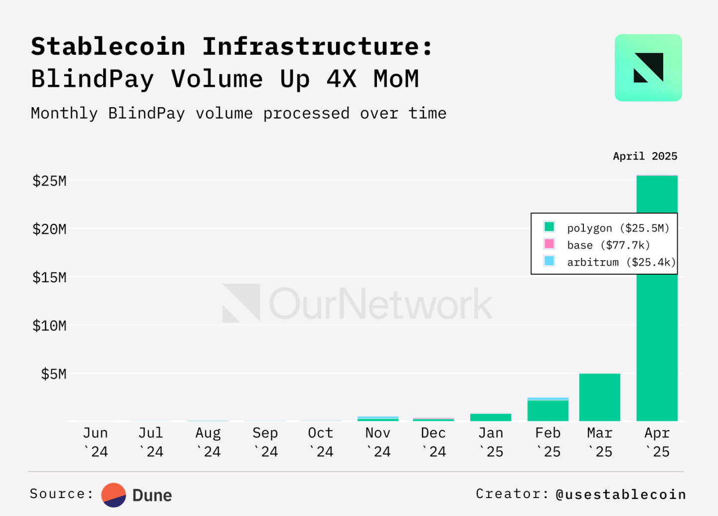 YC が支援するスタートアップ企業である Blindpay は、統合されたマルチレール決済 API を提供しています。同社は USDC と USDT で 3,900 万ドルを処理しており、取引の 95% は Polygon で発生しています。 2024年には急速な成長を遂げ、4月の取引量は1月の30倍となりました。