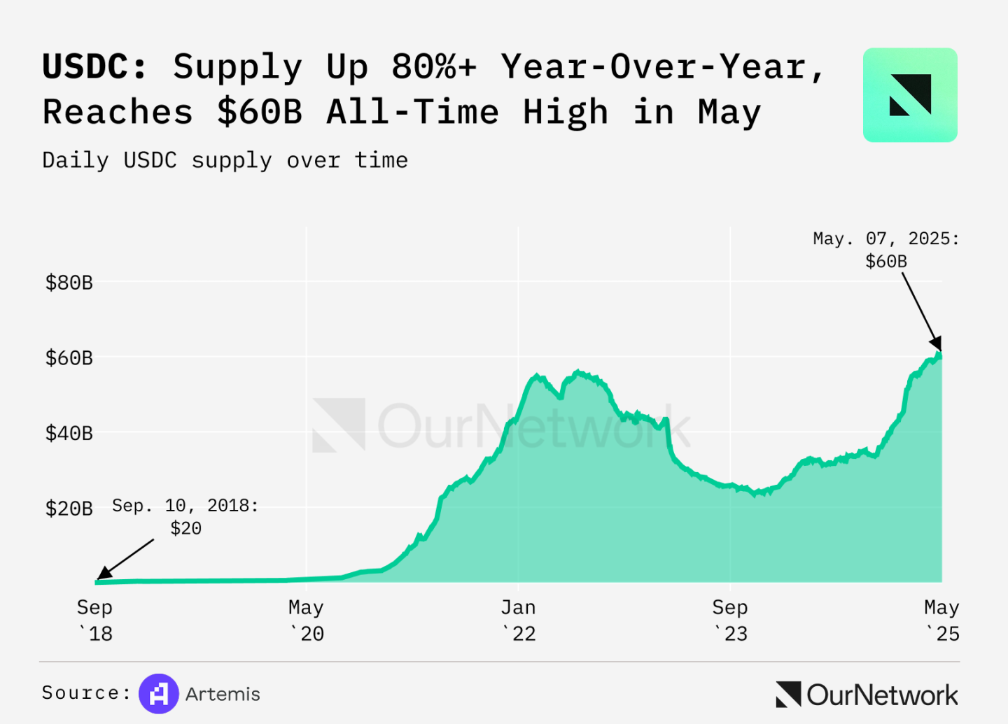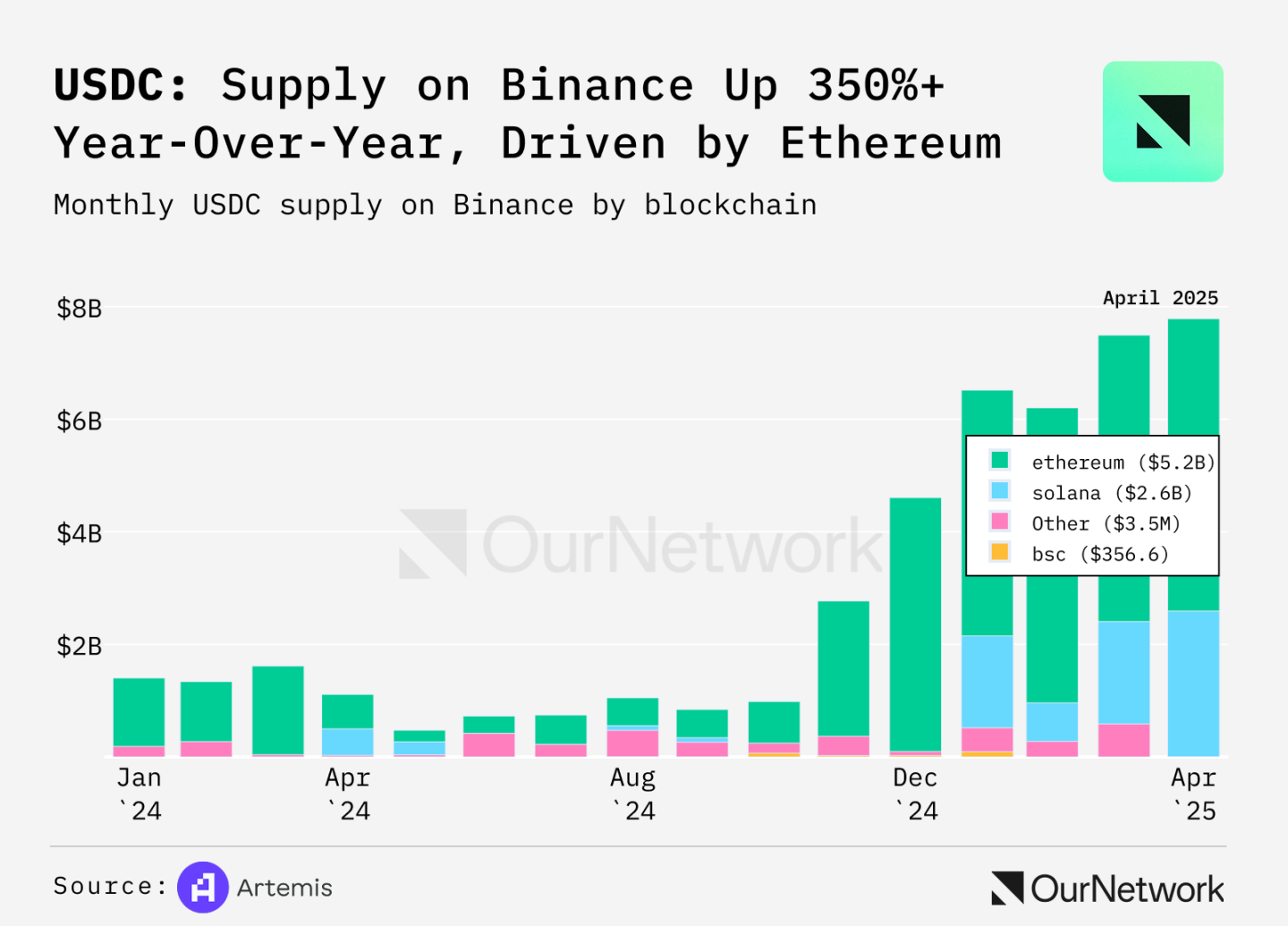 ステーブルコインの人気が高まり、その使用例が増えるにつれて、Circle の USDC の成長は加速し、供給量は 600 億ドルを超え、前年比 80% 増加しました。 USDC のステーブルコイン市場におけるシェアは、2024 年 4 月の 20% から 2025 年 4 月の 25% へと増加し続けています。この成長は、エコシステム (Layer 2 の Base など) と取引所 (Binance など) の大幅な拡大によって推進されています。