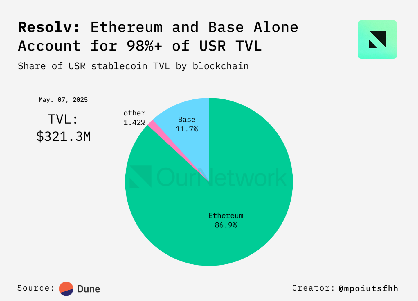 ResolvのUSRステーブルコイン供給の大部分は依然としてイーサリアムに集中しており、その強い需要とDeFiインフラへの深い統合を示しています。同時に、Resolv は Base、Arbitrum、BNB Chain、Berachain に拡大し、クロスチェーンの相互運用性を強化するための戦略的取り組みを示しています。