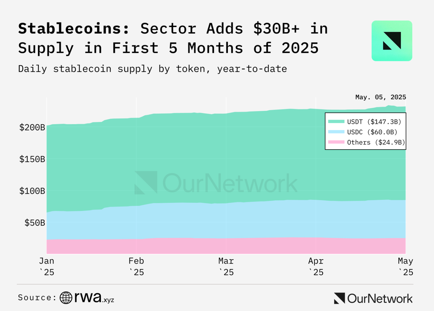 ステーブルコインの時価総額は2025年に2,320億ドルを超え、年初来15%増となる見込み