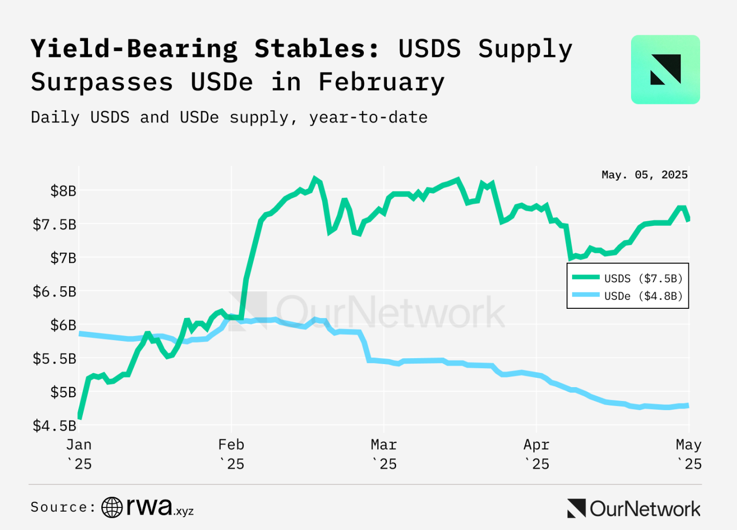 2月にSkyのUSDS供給量はEthenaのUSDEを上回りました。市場環境が悪化し、USDe のステーキングによる収益が 2 桁後半から 1 桁に減少したため、USDe の供給量は 10 億ドル以上減少しました。一方、USDSの供給は、より安定し予測可能な収益の恩恵を受けて、30億ドル近く増加しました。
