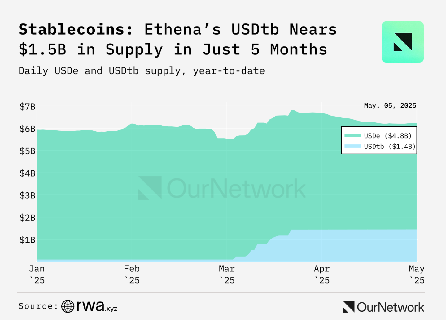 2025年にはステーブルコイン市場は300億ドル成長し、時価総額は合計2,320億ドルに達する。 USDT と USDC は依然として優勢で、合計市場シェアは 89% です。しかし、MiCA(EU暗号資産市場規制枠組み)関連の上場廃止事件により、USDTの市場シェアは68%から62%に低下し、USDCは26%に上昇しました。イーサナが発行し、米国債(主にブラックロックのBUIDLファンド)に裏付けられたスカイのUSDSとUSDtbは、利回りを生み出すステーブルコインの中でも際立っており、40億ドル以上増加した。 USDtbの時価総額は8,900万ドルから14億ドルに急増し、市場のボラティリティの中でより安全な選択肢としてEthenaエコシステムにおける重要な役割を反映しています。