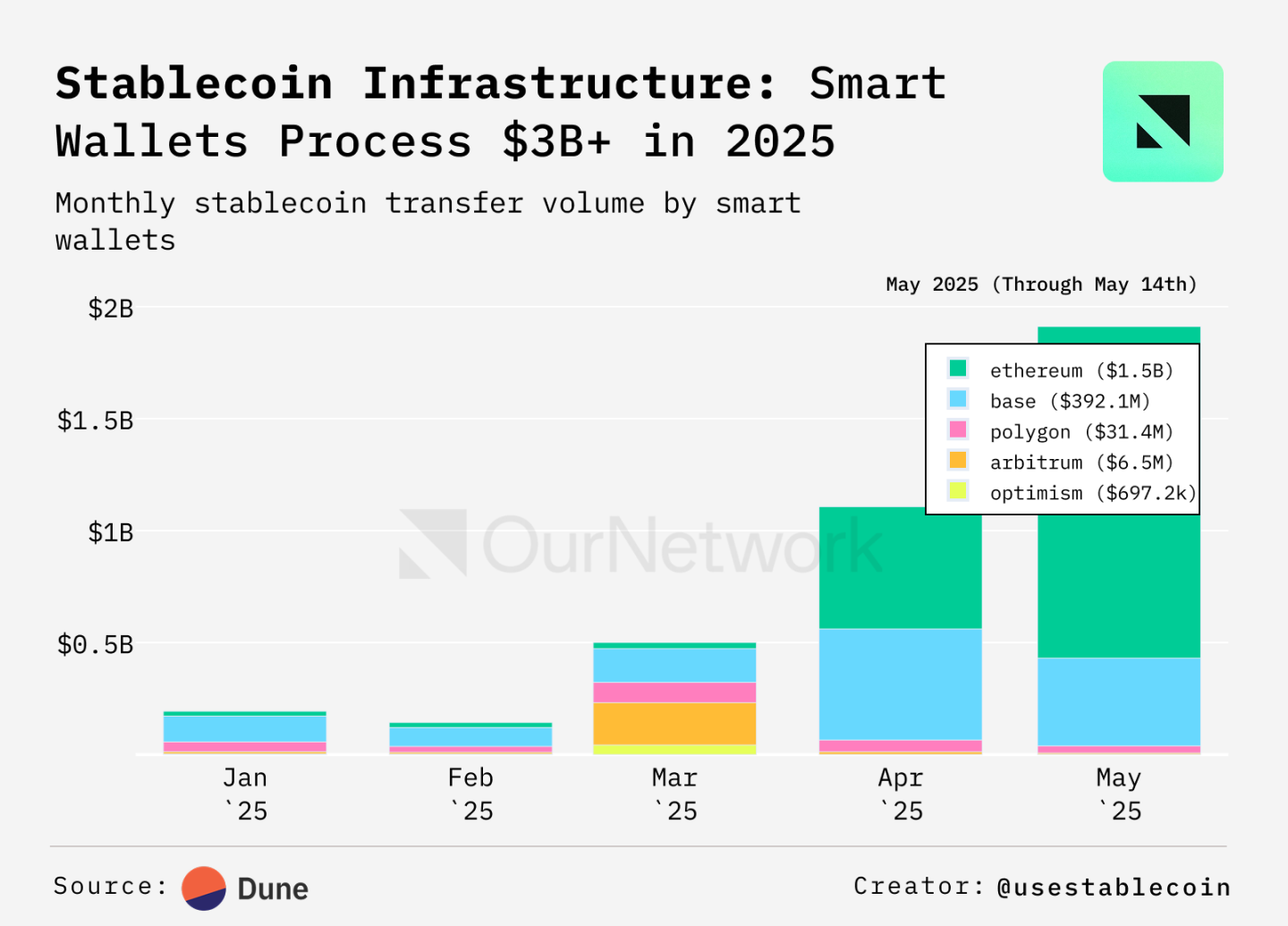 2025 年以降、アカウント抽象化をサポートするウォレットは、446 万件のトランザクションで 24 億ドルを超えるステーブルコイン トランザクションを処理しました。これらのスマートウォレットは、ガスフリーのトランザクション、キー管理、回復モジュールを通じてユーザーエクスペリエンスを簡素化します。その中で、Base は 10 億ドルを超える取引量と最もアクティブなウォレットでトップを占めており、一方、Polygon は最も高い取引量 (193,000) を誇り、マイクロトランザクションやアプリ主導のアクティビティにおける優れたパフォーマンスを示しています。