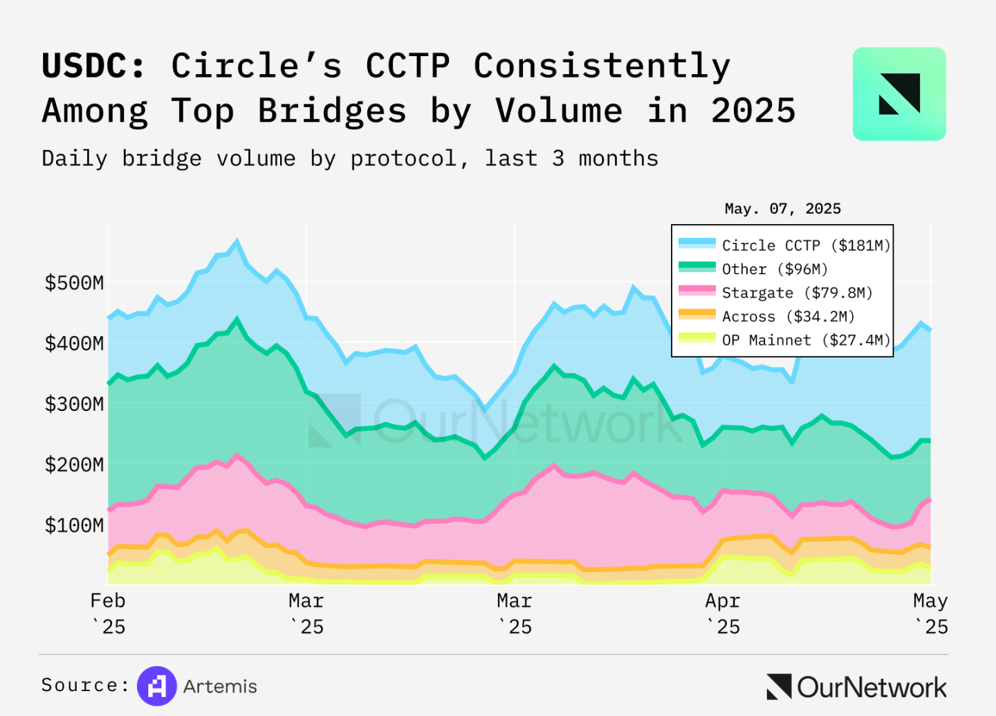 Circle の CCTP (クロスチェーン転送プロトコル) は、USDC の成長を促進する重要な要素の 1 つです。 Artemisのデータによれば、その取引量はクロスチェーンブリッジの中で常に第1位となっている。 CCTPはユーザーがチェーン間でUSDCを転送することを可能にし、その週の取引量は3か月ぶりの高水準となる2億ドルを超えた。
