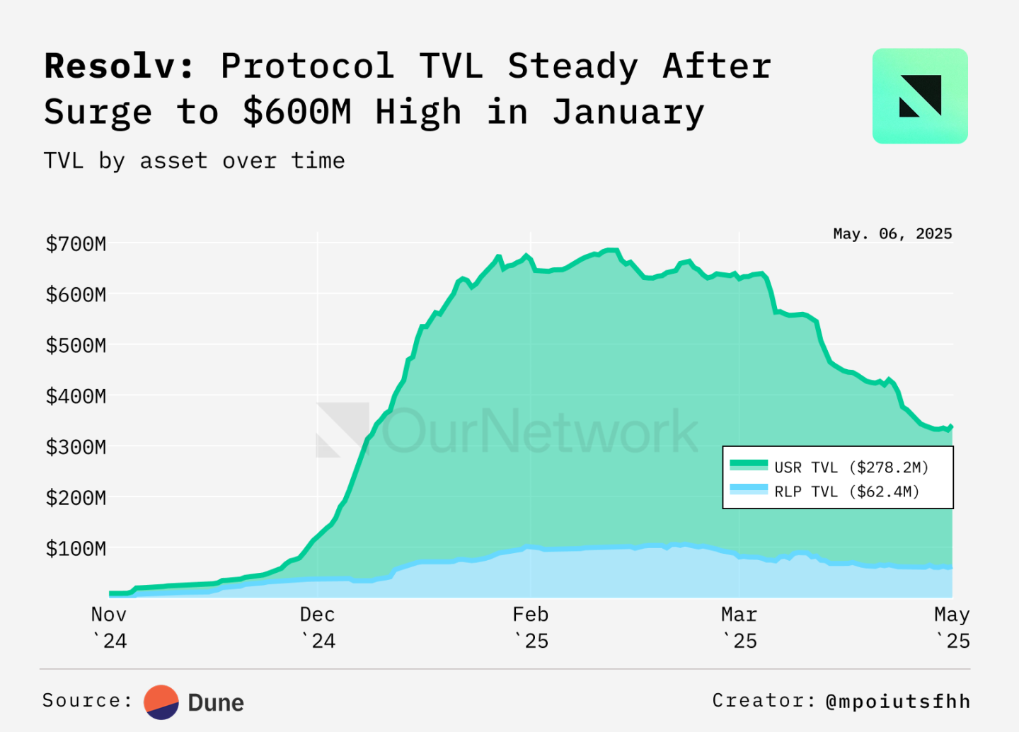 Resolv は、暗号資産に裏付けられ、方向性のあるリスクフリーの状態を維持するために短期の永久契約によってヘッジされた USD ペッグトークンである USR を発行する、暗号ネイティブのステーブルコイン プロトコルです。市場リスクとヘッジリスクは高利回りトークンRLPが負担し、USRの安定性と資本効率を維持します。この構造により急速な成長が促進され、Resolv のトータルロックバリュー (TVL) は 2024 年末の 1,000 万ドルから 2025 年初頭には 6 億ドル以上に急上昇しましたが、年半ばには 4 億ドルを下回りました。このピークは、方向性のないリスクフリーのステーブルコインの設計に対する市場の強い信頼を反映しています。