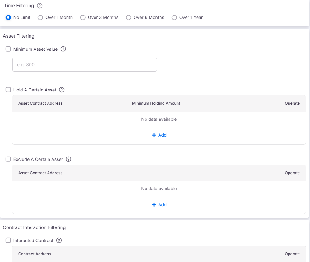 Creditlinkは、強力かつ柔軟なバッチアドレスフィルタリングシステムを提供します。ユーザーは、txtファイルを直接アップロードしてウォレットアドレスを一括インポートし、多次元条件を組み合わせることで、効率的なスクリーニングと分析を実現できます。サポートされている主要なスクリーニング次元は以下の通りです。