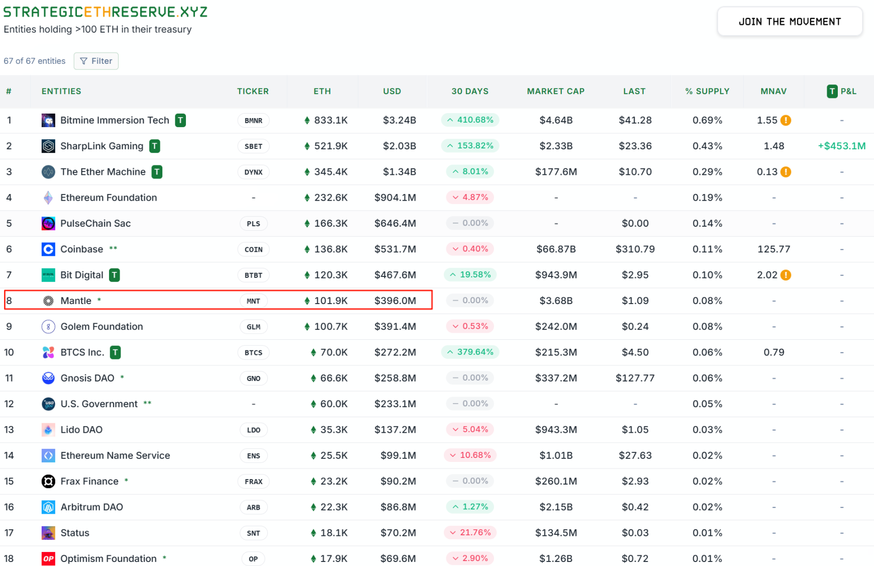 本日現在、strategythreserve のデータによると、Mantle の保有量は Ethereum 財務準備金ランキングで 8 位にランクされており、ETH 準備金が最も大きい L2 プロトコルとなっています。