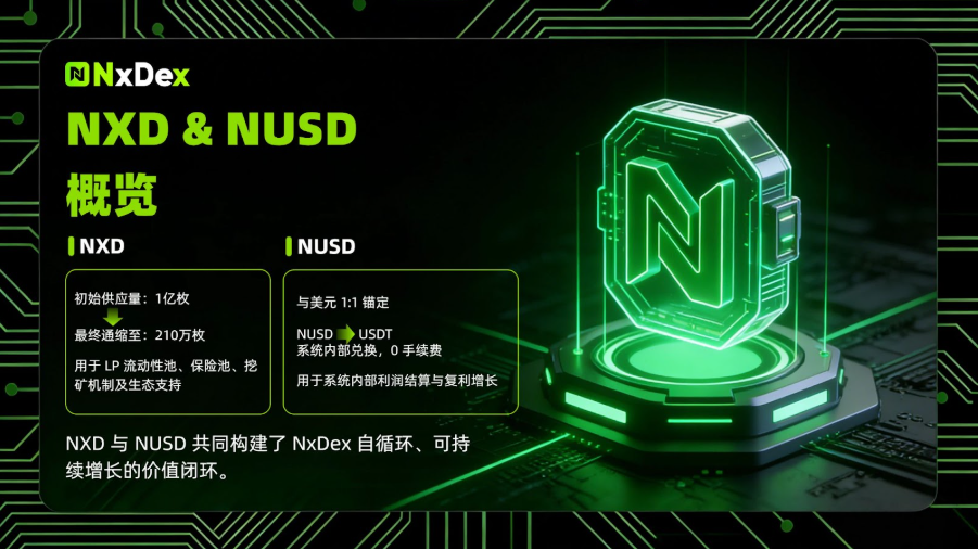 NxDex は、システムの経済サイクルの中核コンポーネントとしてネイティブ トークン NXD を導入します。