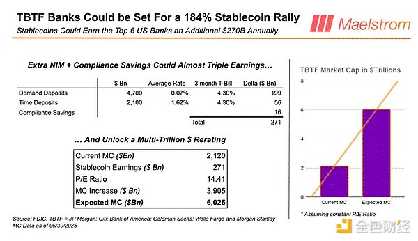 「大きすぎて潰せない」銀行がステーブルコインを導入すれば、最大6.8兆ドルの国債購買力が生まれる可能性がある。