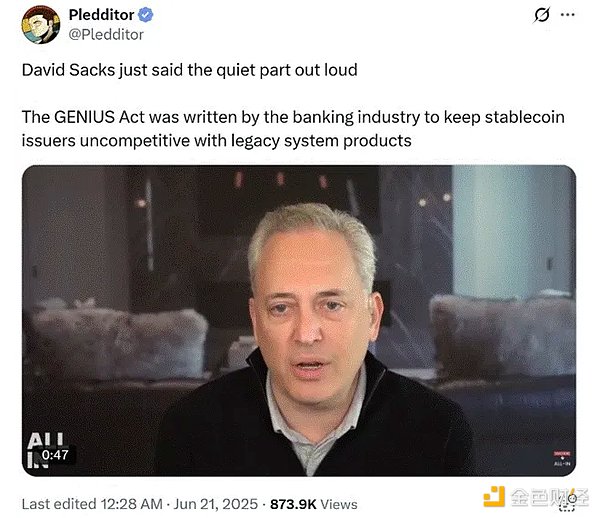 トランプ大統領の「仮想通貨皇帝」デビッド・サックス氏も同意見だ。多くの企業の仮想通貨寄付者は、仮想通貨キャンペーンに多額の寄付をしたにもかかわらず、利益率の高い米国ステーブルコイン市場からひっそりと締め出されていることに憤慨しているに違いない。彼らは戦略を転換し、「大きすぎて潰せない」銀行CEOの便器の下で腰掛けを探すのではなく、真の経済的自由を真に訴えるべきだろう。