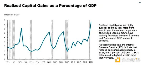 議会予算局のこのグラフには2021年までのデータしか含まれていませんが、2008年の世界的金融危機後、米国株式市場が上昇を続けるにつれて、キャピタルゲイン税収入が急増したことが明確に示されています。
