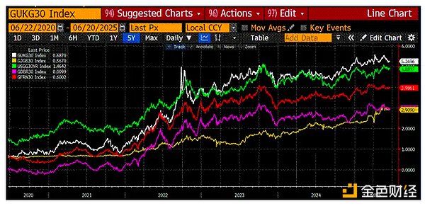 これらは、英国(白)、日本(金)、米国(緑)、ドイツ(マゼンタ)、フランス(赤)の 30 年国債の利回りです。