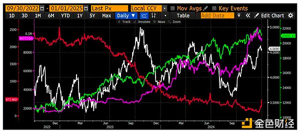 ATI政策はRRP(赤)を効果的に押し下げ、ナスダック100(緑)やビットコイン(マゼンタ)などの金融資産を押し上げました。10年米国債利回り(白)は5%を突破したことがありません。