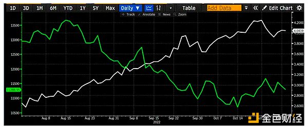 2022年第3四半期は特に目立った出来事はありませんでした。下のチャートはナスダック100指数(緑)と10年国債利回り(白)を示しており、利回りが急上昇する一方で株価が急落した様子が見て取れます。