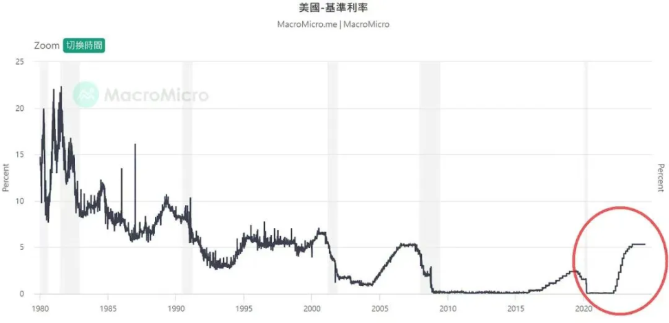 3つの赤い点は、ビットコインの過去3回の半減期を示しています。半減期のたびに半減期市場が形成され、これが多くの人々が2024年の強気相場に期待を寄せる理由の一つとなっています。ビットコインは2024年4月に4度目の半減期を迎えます。しかし、過去3回の半減期はすべて低金利環境で発生し、その間のベンチマーク金利は1%を下回っていたのに対し、現在のベンチマーク金利は5.25%を超えていることに気づいていますか?